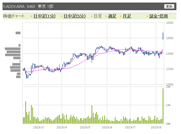※カドカワの時価総額、800億円割れ(カワンゴ体制終焉)から1173億円(2019/08/09)に