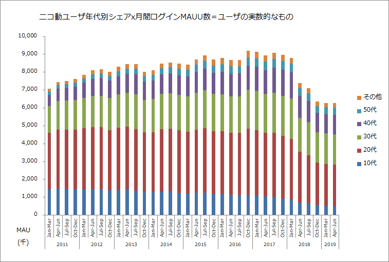 ユーザが固定化しているなら年齢構成の高齢化トレンドは大きく変わらないわけですけど(←これはニコ動に限らず)、アクティブユーザの実数のようなものをざっくり計算したものにしてやるとモメンタムの回復が見込みにくそうな気もしますがどうでしょうか pic.twitter.com/XZUZiBcWPg