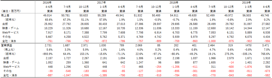セグメント別損益見ると、出版は1Qにしては良い方だけど前年・前々年が低すぎるだけとも見えるし、ニコ動中心のWebサービスも黒転したとはいえトップラインの成長回復しないと利益がこれ以上上に出るかというとという感じだし、今回は特に映像・ゲームの利益の強さが目立ちますね、という印象です pic.twitter.com/fvvhGCMQUJ