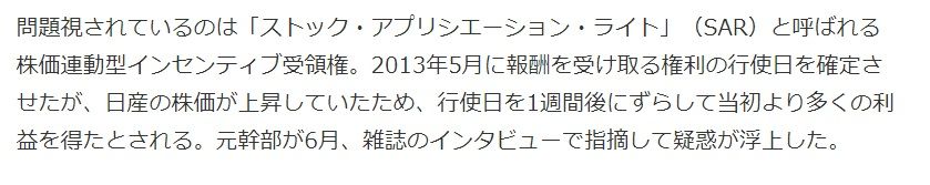 株価上昇を受け行使日を1週間後にずらし、多くの利益を得たとの指摘。日産の西川広人社長兼CEOが、株価に連動する役員報酬制度で社内規定に違反し、不当に数千万円を上乗せして受け取った疑いが浮上しました。https://t.co/T2Iucia5qI