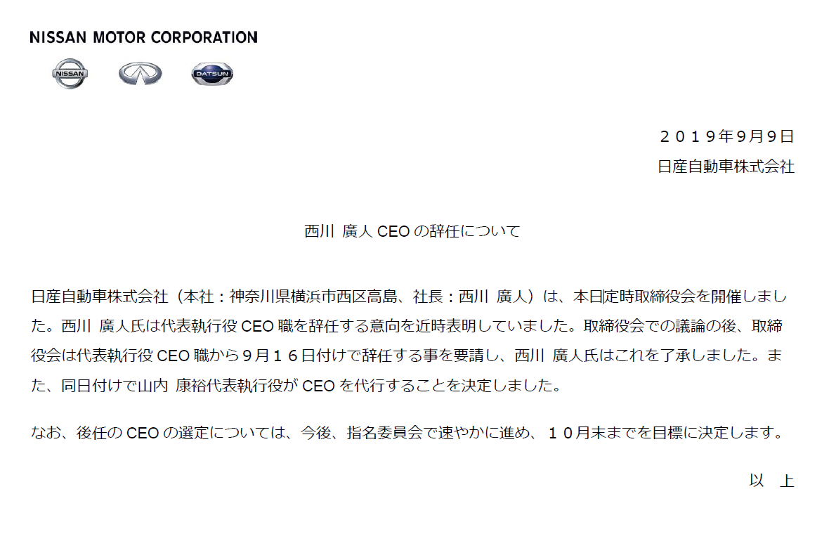 2019/09/09 21:05 日産自動車 西川廣人CEO の辞任について