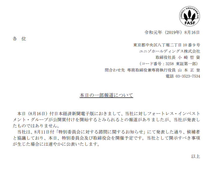 2019/08/16 10:50 ユニゾホールディングス 本日の一部報道について