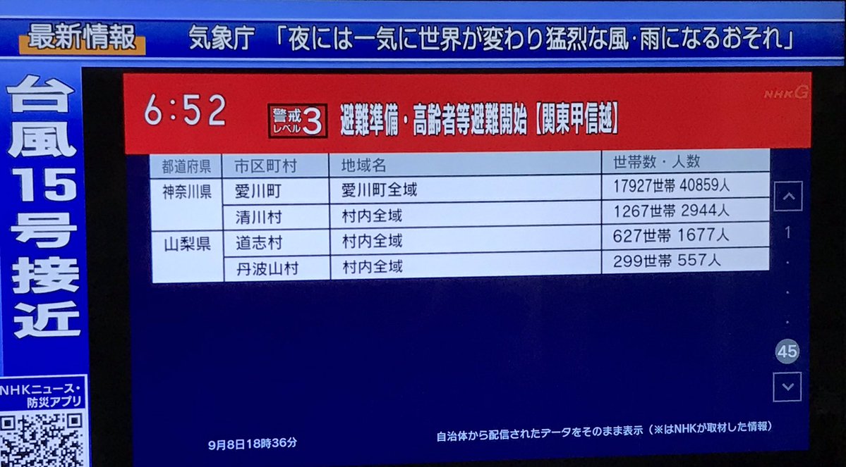 関東では首都圏を含め最大瞬間風速60m/s(時速216km)の記録的暴風が予想されています.これは昨年大阪に甚大な風害をもたらした台風21号と同規模の暴風です.関東ではこれから世界が一変し,普段考えられないような事が起こります.必ず万全の備えをお願いします. pic.twitter.com/sqQGt6Auc8