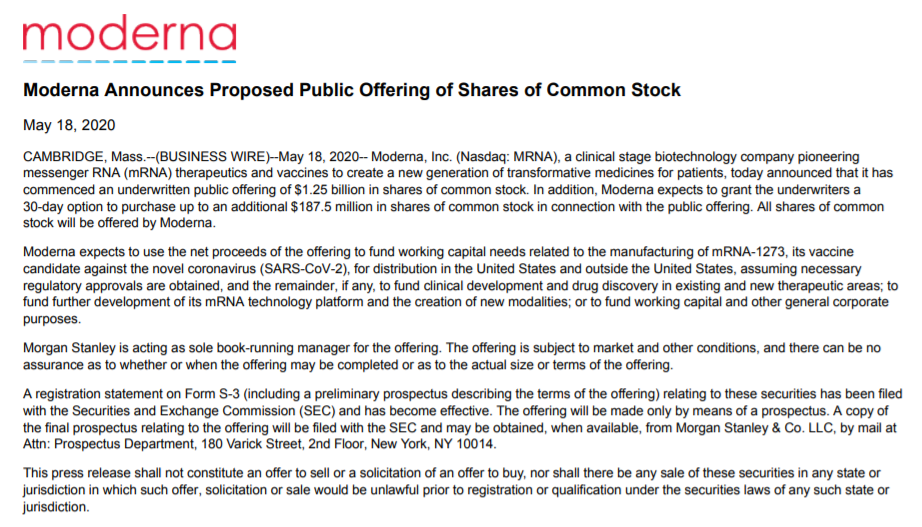 モデルナ、早速公募増資ですか。治験で良い結果が出たにしても、12億5000万ドルってまたすごい金額だな。皆が株価持ち上げてくれてる今のうちに集められるだけ集めておこうって感じかwhttps://t.co/wy4VOumDnQ