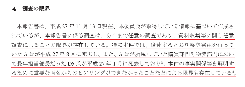 D5氏が平成27年1月に死去しており、本件の事実関係等を解明するために重要な両名からのヒアリングができなかったことなどによる限界も存在