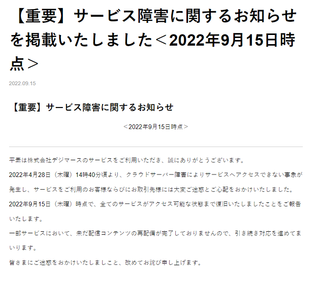 【重要】サービス障害に関するお知らせを掲載いたしました<2022年9月15日時点> | 株式会社デジマース https://t.co/ulVE6yuN0v