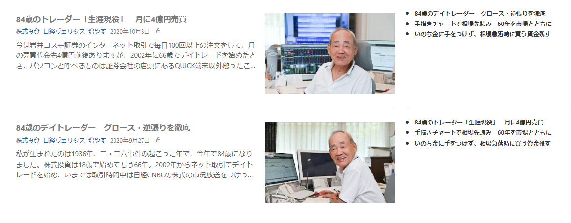 87歳のデイトレーダーの人、2011年から11回も日経に出てたわ
