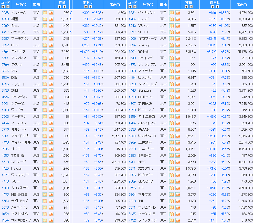 ※東証グロース市場(左)と東証プライム市場(右)の下落率上位(2026/02/24)