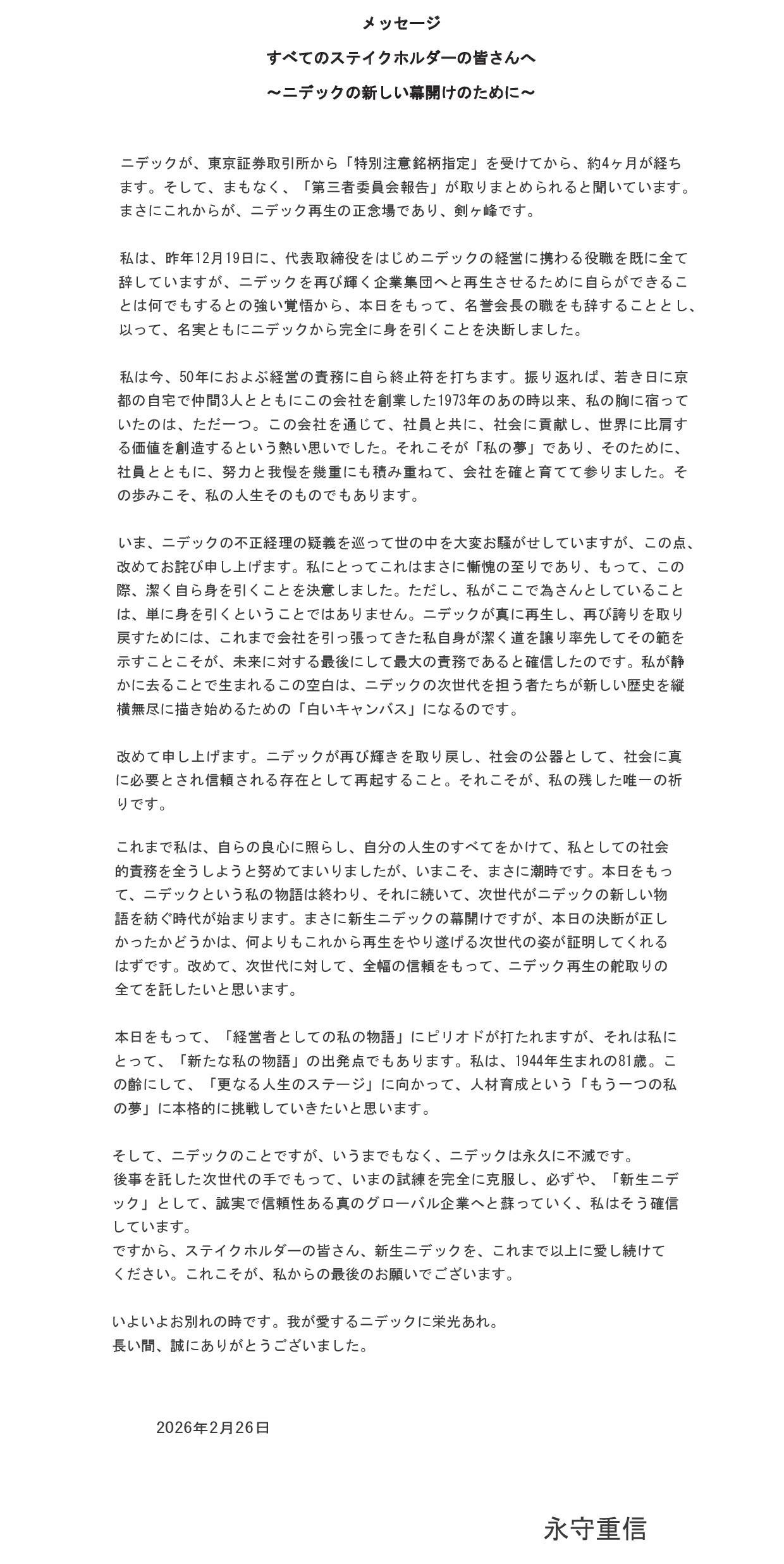 永守御大のメッセージ、最後まで「俺はなんにも悪くない」を貫き、これからは人材育成をとか寝言を言っててすごい。