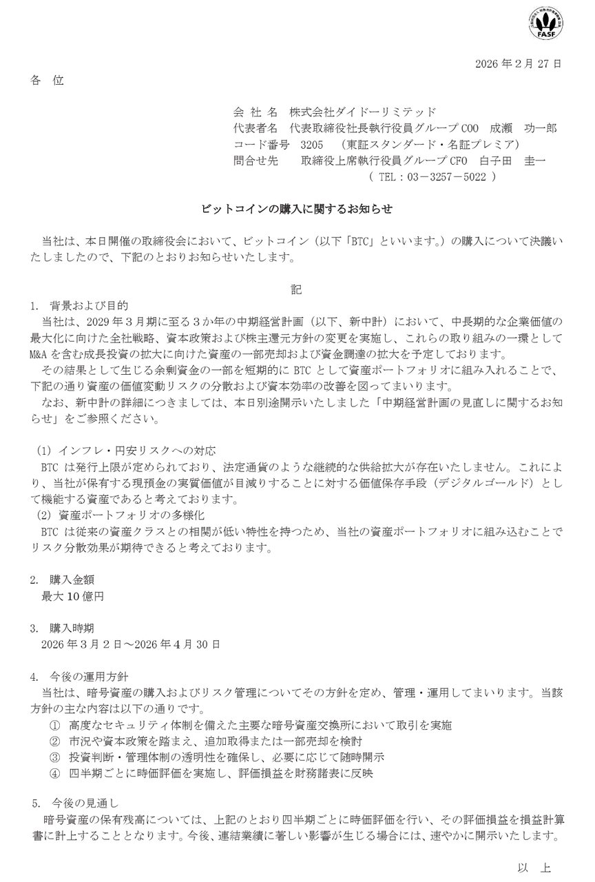 うわぁ…ダイドーリミテッド、BTCトレジャリーを今更やんのかよ、しかも配当減らして、マジで最悪だな、クソ過ぎる。
