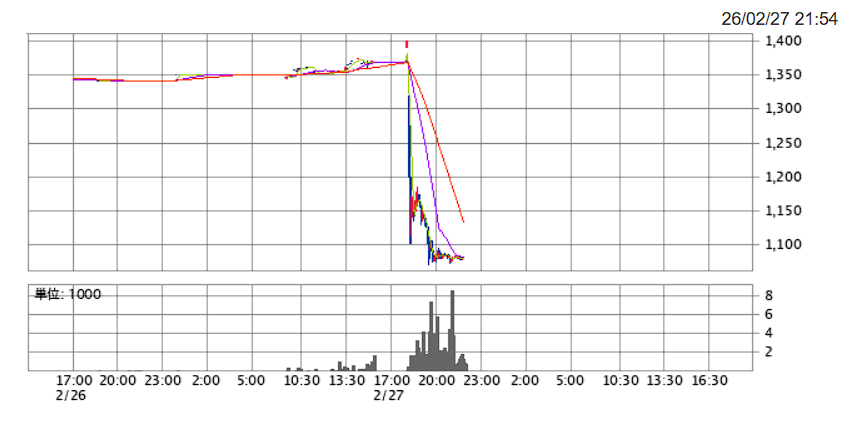 ※夜間取引市場で一瞬急騰した後に爆下げ