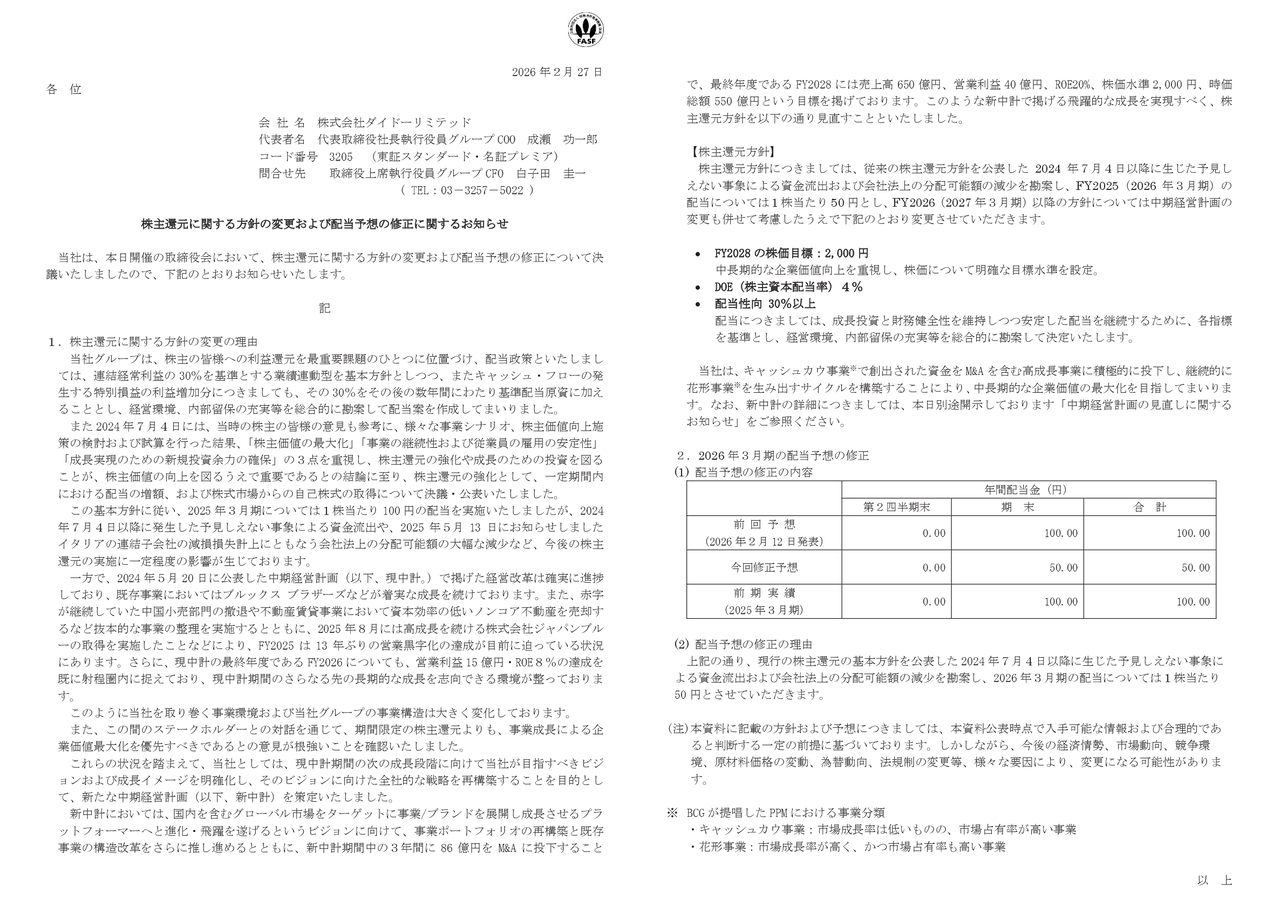 2026/02/27 ダイドーリミテッド株主還元に関する方針の変更および配当予想の修正に関するお知らせ「現行の株主還元の基本方針を公表した2024 年7月4日以降に生じた予見しえない事象による資金流出および会社法上の分配可能額の減少を勘案」