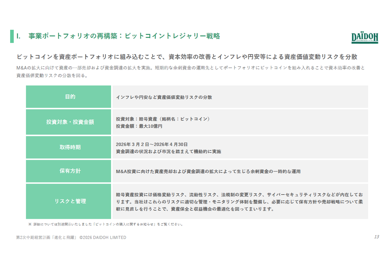 「余剰資金の一部を短期的にBTCとして資産ポートフォリオに組み入れる」