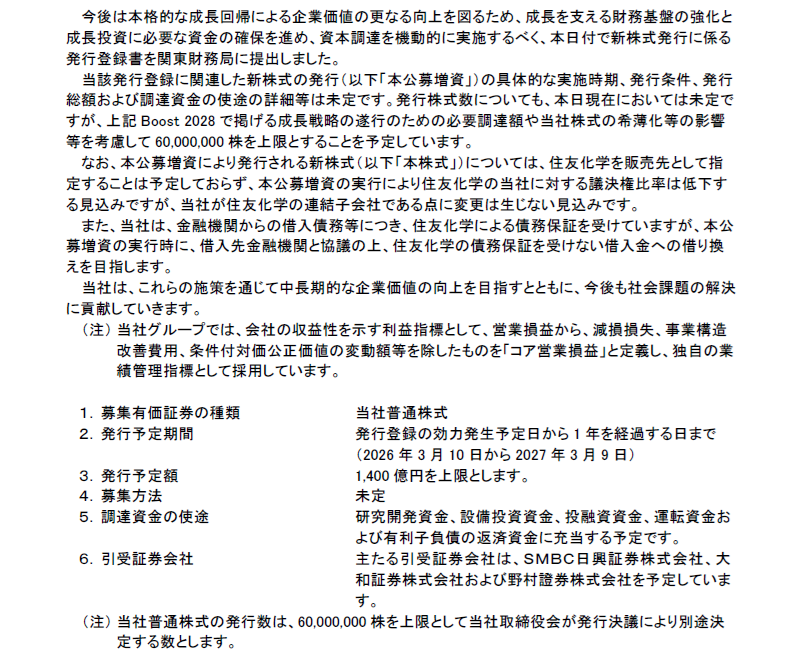 2026/03/02 住友ファーマ新株式発行に係る発行登録に関するお知らせ